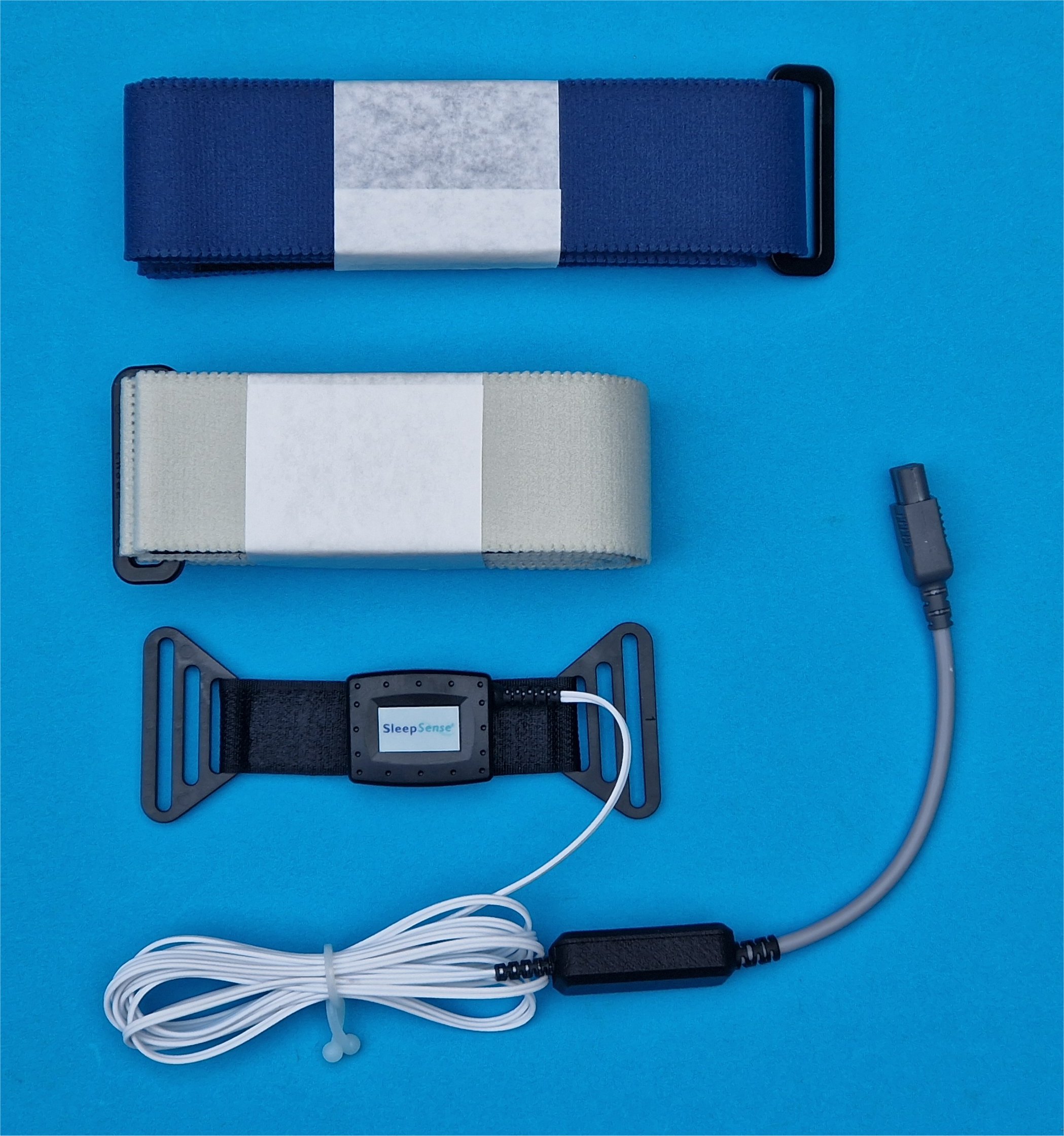 Respiration belt SleepSense 1387-kit. Using a piezoelectric crystal, the respiration effort sensor converts chest or abdominal respiration movement to clear, reliable respiration waveforms. Strong reliable signals are available because the respiration belt uses the power-supply from the Active3 system. Connects to 1 of the 6 Universal auto-configuring Active3 AUX inputs. |